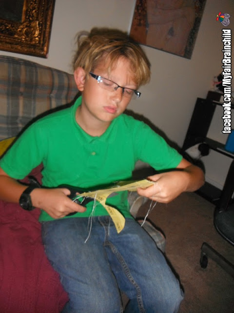This week Project Runway designers paired off for their first team challenge so I enlisted the help of another Project Runway enthusiast... Brodie. We went to the dollar store to collect prizes comparable to the ones the designers won when visiting Coney Island. We also picked three words they heard to describe out look... tangy, happy and delightful. It was truly a team effort and Brodie contributed a lot to the construction and design of this garment. He even chose a new model for this week. It wouldn't surprise me if you see him on the real Project Runway one day. That kid has style, and a good eye.